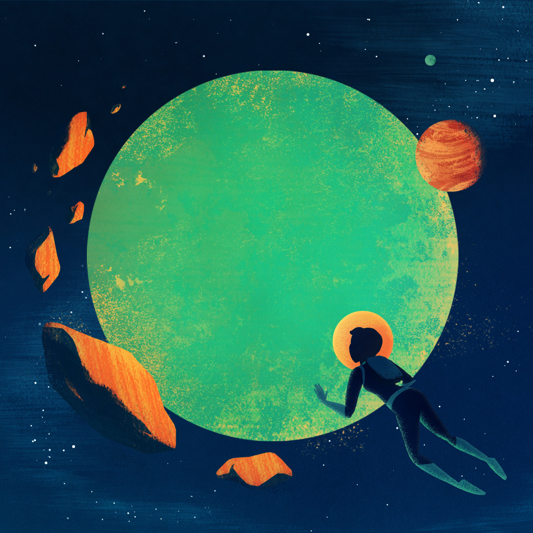 Astronaut overlooks a dry rocky planet, lit by a large moon, surrounded by asteroids and stars.