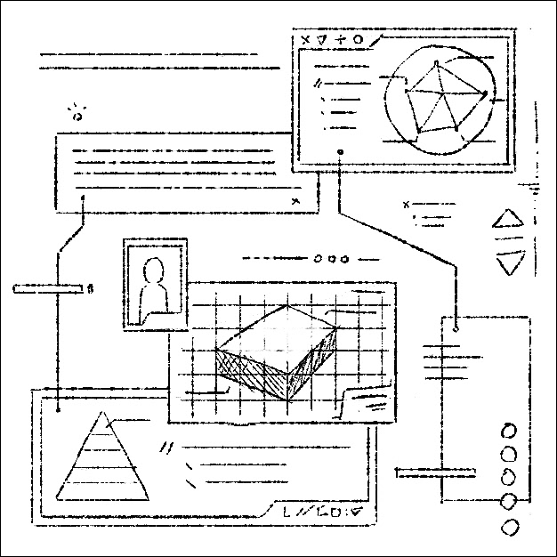 Various windows presenting various options and data are conjoined like puzzle pieces as an astronaut hand reaches to place down a piece.